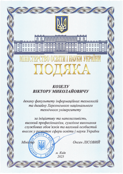 Цю відомчу відзнаку було вручено нашому колезі, який є деканом факультету інформаційних технологій та дизайну ХНТУ, за ініціативу та наполегливість, високий професіоналізм, сумлінне виконання службових обов’язків та вагомий особистий внесок у розвиток сфери освіти і науки України.