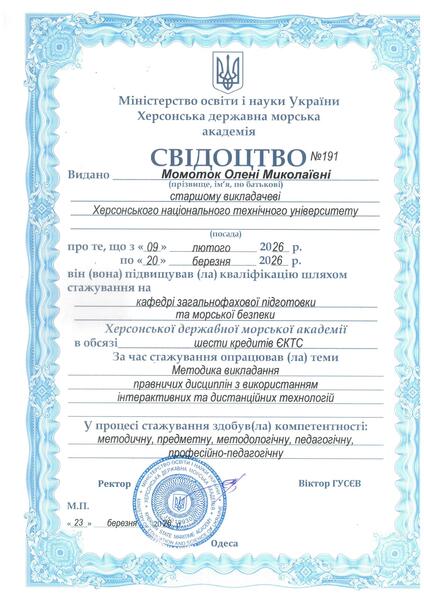 Старший викладач кафедри економіки, підприємництва та економічної безпеки Олена Момоток успішно пройшла підвищення кваліфікації на базі Херсонської державної морської академії. Стажування тривало у період з 9 лютого по 20 березня 2026 року та було присвячене актуальним питанням методики викладання правничих дисциплін із використанням інтерактивних та дистанційних технологій. У межах програми було опрацьовано сучасні підходи до формування професійних компетентностей, зокрема методичних, предметних, педагогічних і професійно-педагогічних.