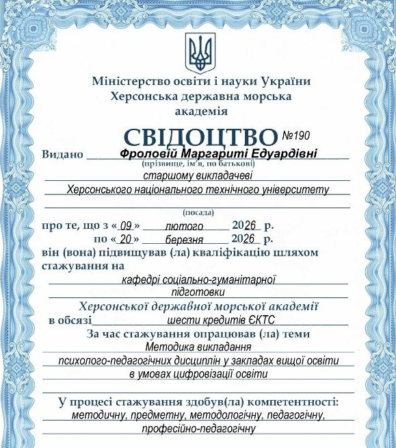 Викладач кафедри Фролова М. Е. успішно пройшла підвищення кваліфікації у Херсонській державній морській академії за темою: «Методика викладання психолого-педагогічних дисциплін у закладах вищої освіти в умовах цифровізації освіти».