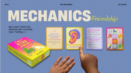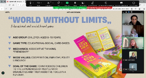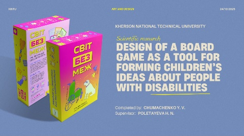 Студентка кафедри дизайну ХНТУ ОП «Дизайн» Яна Чумаченко отримала диплом ІІ ступеня за напрямом «Art and Design» з презентацію наукової роботи «DESIGN OF A BOARD GAME AS A TOOL FOR FORMING CHILDREN’S IDEAS ABOUT PEOPLE WITH DISABILITIES» («Дизайн настільної гри як інструмент формування у дітей уявлень про людей з інвалідністю»), створеної під керівництвом к.т.н., доцента Ганни Полєтаєвої.