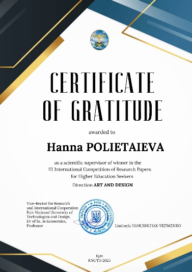 About University / Новини університету / СТУДЕНТКА КАФЕДРИ ДИЗАЙНУ ЯНА ЧУМАЧЕНКО СТАЛА ПЕРЕМОЖЦЕМ МІЖНАРОДНОГО КОНКУРСУ СТУДЕНТСЬКИХ НАУКОВИХ РОБІТ