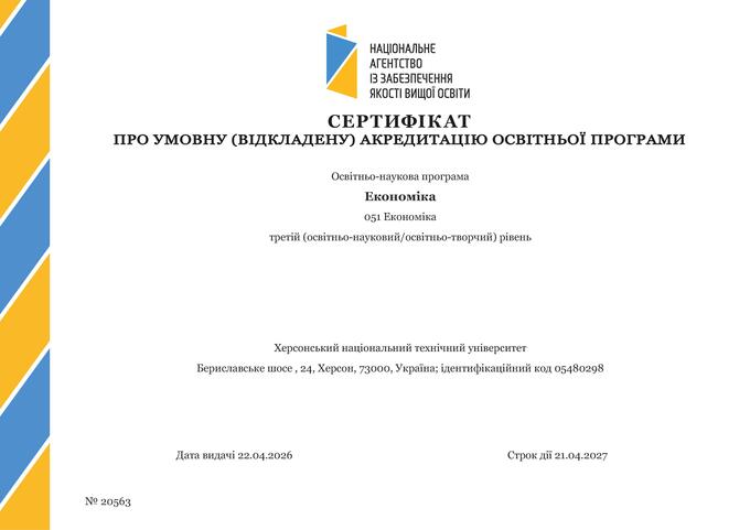 Освітньо-наукова програма «Економіка» третього (освітньо-наукового) рівня вищої освіти (РhD) Херсонського національного технічного університету успішно пройшла акредитацію та отримала сертифікат про акредитацію від Національного агентства із забезпечення якості вищої освіти (НАЗЯВО). Акредитація стала результатом злагодженої роботи викладачів кафедри Економіки, підприємництва та економічної безпеки, гаранта освітньої програми д.е.н., професора Наталії Шандової, аспірантів, адміністрації ХНТУ та стейкхолдерів, залучених до процесу підготовки та оцінювання.