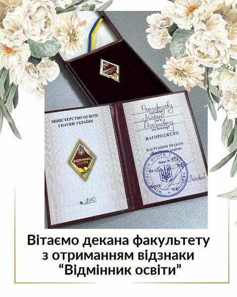 About University / Новини університету / ВІТАЄМО ДЕКАНА ФАКУЛЬТЕТУ ІНТЕГРОВАНИХ ТЕХНОЛОГІЙ З ОТРИМАННЯМ ВІДЗНАКИ «ВІДМІННИК ОСВІТИ» |