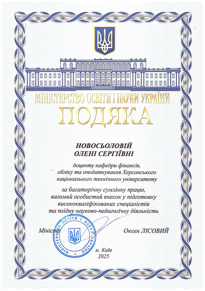Ця почесна відзнака є визнанням високого професіоналізму, відданості науково-педагогічній діяльності та невтомного прагнення до вдосконалення освітнього процесу. Завдяки Вашій щоденній праці, відповідальному ставленню до здобувачів і постійним науковим пошукам кафедра фінансів, обліку та оподаткування гідно представляє Херсонський національний технічний університет у науковій та освітній спільноті.