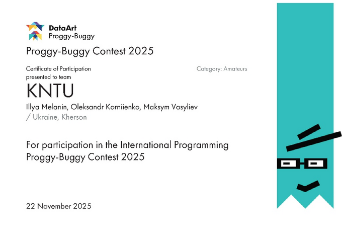 22 листопада 2025 року відбулася «International Programming Proggy-Buggy Contest 2025» міжнародна олімпіада з програмування від DataArt — командний онлайн/офлайн конкурс з розв'язання 13 алгоритмічних задач за 42 хвилини. Це стартовий майданчик у світі спортивного програмування для тренування аналітичного мислення, швидкості прийняття рішень і командної взаємодії. Це саме ті навички, які сьогодні цінують у професійному світі. Участь в олімпіаді взяли здобувачі спеціальності F2 «Інженерія програмного забезпечення»: 1го курсу - Ілля Меланін та 2го курсу – Васильєв Максим і Корнієнко Олександр. Команда отримала сертифікат за участь.
