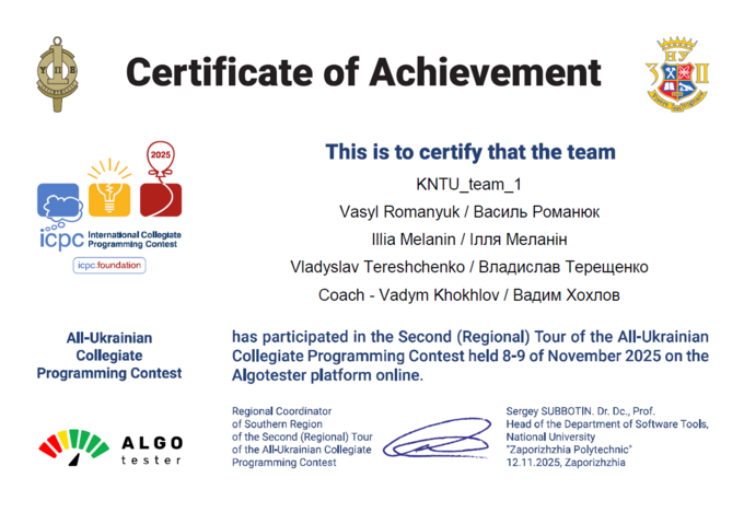 Міжнародна олімпіада з програмування ICPC (International Collegiate Programming Contest) — це найбільша та найпрестижніша студентська командна олімпіада з програмування у світі, в якій беруть участь тисячі навчальних закладів з різних країн. В цьому році 8-9 листопада здобувачі спеціальності F2 «Інженерія програмного забезпечення» взяли участь у такій олімпіаді. Команда в складі першокурсників: Меланіна Іллі, Романюка Василя, Терещенка Владислава та тренера Хохлова Вадима - отримали сертифікат про участь у 2му етапі.