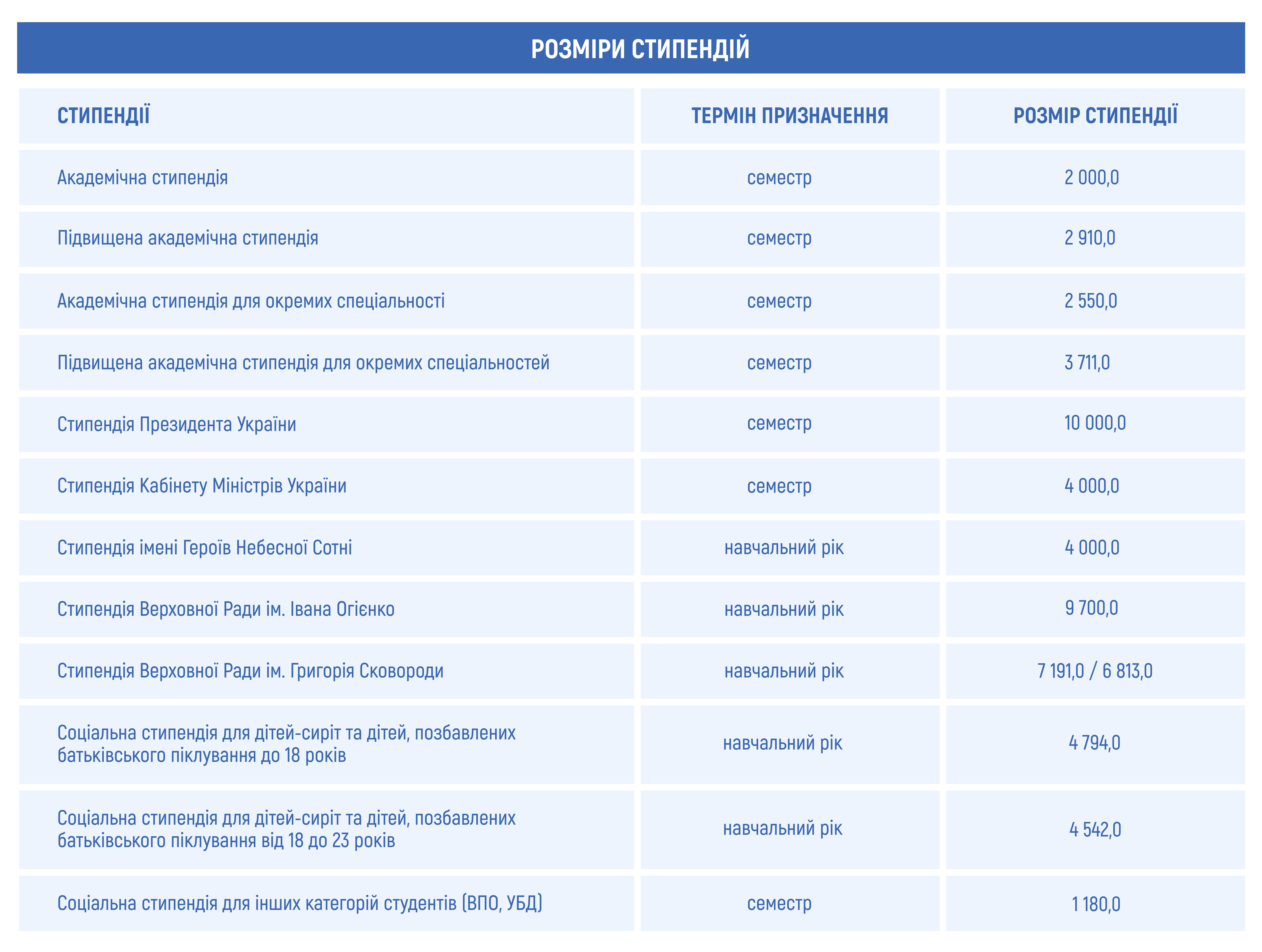 Розмір академічних стипендій для студентів, визначається виходячи з установленого Кабінетом Міністрів України розміру мінімальної ординарної (звичайної) академічної стипендії для Університету, умов навчання, спеціальності, спеціалізації (групою спеціалізацій ОС «Бакалавр» для 1 – го курсу 1-го семестру), успішності стипендіата.