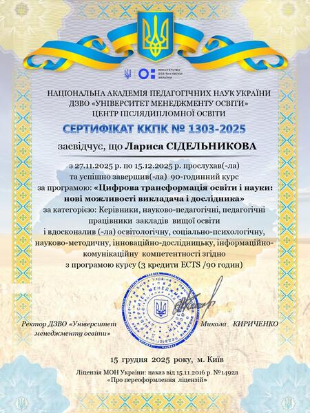 | Підвищення кваліфікації в Українському державному університеті імені Михайла Драгоманова, 19.11.2025 р., за програмою «Цифровий простір в освіті: навчання, мотивація, штучний інтелект і кібербезпека» в обсязі 0,1 кредит ECTS (3 години). Сертифікат № 38450-25 від 24.11.2025 р. |