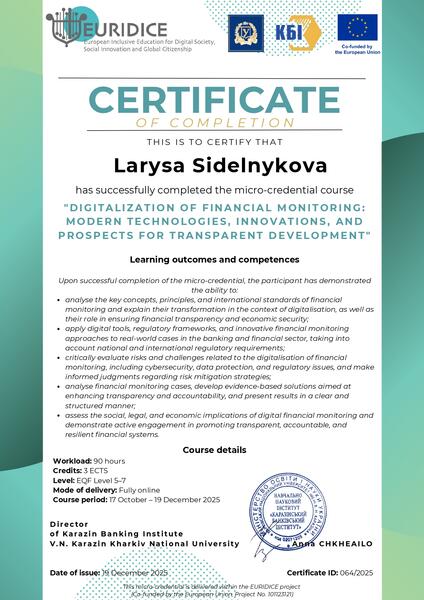 Micro-credential course «Digitalization of Financial Monitoring: Modern Technologies, Innovations, and Prospects for Transparent Development», delivered by the Karazin Banking Institute of V. N. Karazin Kharkiv National University, from 17 October to 19 December 2025.