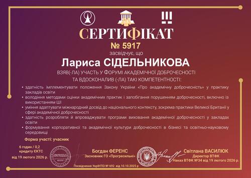 | Форум академічної доброчесності у Вінницькому технічному фаховому коледжі та ГО «Прогресильні», 19.02.2026 р., сертифікат № 5917 від 19.02.2026 р. в обсязі 0,2 кредиту ЄКТС (6 годин). |
