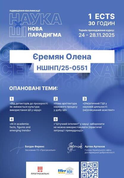 | Підвищення кваліфікації від ГО «Прогресильні» на тему: «Наука × ШІ: нова парадигма», 24.11.2025 р. - 28.11.2025 р., сертифікат НШІНП/25-0551 в обсязі 1 кредиту ЄКТС (30 годин). |