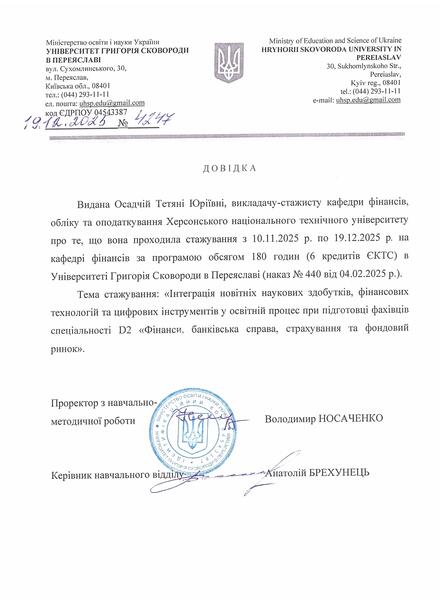 Університет Григорія Сковороди в Переяславі, стажування на тему: «Інтеграція новітніх наукових здобутків, фінансових технологій та цифрових інструментів у освітній процес при підготовці фахівців спеціальності D2 «Фінанси, банківська справа, страхування та фондовий ринок», 10.11.2025 р. – 19.12.2025 р., довідка № 4247 від 19.12.2025 р. в обсязі 6 кредитів ЄКТС (180 годин).