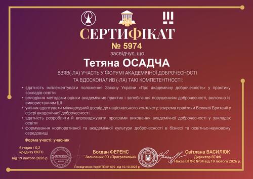 Форум академічної доброчесності у Вінницькому технічному фаховому коледжі та ГО «Прогресильні», 19.02.2026 р., сертифікат № 5974 від 19.02.2026 р. в обсязі 0,2 кредиту ЄКТС (6 годин).