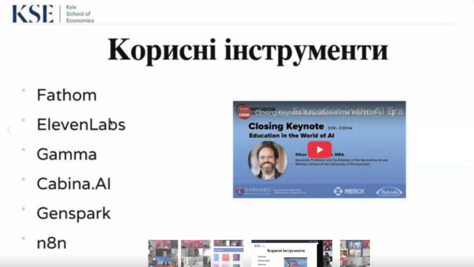 Курс охоплював широке коло тем, зокрема: вплив штучного інтелекту на вищу освіту, інтеграцію ШІ в діяльність закладів освіти, дотримання принципів академічної доброчесності в умовах використання новітніх технологій, трансформацію підходів до оцінювання та змісту освітніх програм, а також роль ШІ у персоналізованому навчанні та наукових дослідженнях. Значну увагу було приділено й правовим аспектам використання ШІ, питанням етики, відповідального ставлення до впровадження інновацій, а також сучасним практикам роботи з генеративними моделями, зокрема технікам промпт-інжинірингу.