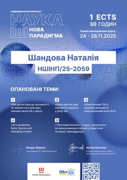 | Проходження курсу підвищення кваліфікації «Наука ✕ ШІ: нова парадигма» від ГО "Прогресильні" та Українського офісу дослідницької доброчесності. Сертифікат № НШІНП_25-2059 (24 листопада - 28 листопада) |