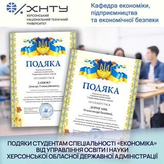 З нагоди Міжнародного дня студента студенти кафедри були відзначені Подяками Управління освіти і науки Херсонської обласної державної адміністрації за сумлінне ставлення до навчання, активну участь у студентському житті, ініціативність, відповідальність та вагомі особисті досягнення. Подяки отримали Олександра Дорогань та Дмитро Данюк - студенти спеціальності 051 "Економіка", які протягом навчання неодноразово гідно представляли кафедру та Херсонський національний технічний університет на всеукраїнських і міжнародних заходах.