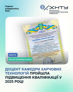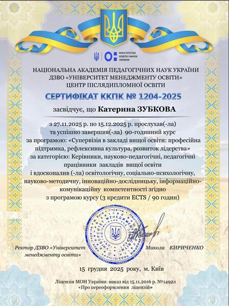 У період з 27 листопада по 15 грудня 2025 року доцент кафедри харчових технологій Зубкова Катерина Віталіївна пройшла та успішно завершила 90-годинний курс (3 кредити ECTS) у ДЗВО «Університет менеджменту освіти» (Центр післядипломної освіти) в межах програм підвищення кваліфікації, що реалізуються за підтримки Міністерства освіти і науки України.