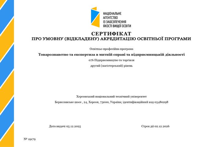 За результатами роботи експертної комісії Національного агентства із забезпечення якості вищої освіти, отримано сертифікат про умовну (відкладену) акредитацію, який підтверджує відповідність програми сучасним стандартам та критеріям якості освітнього процесу.