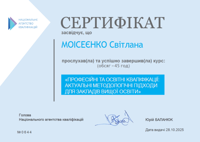 Отриманий сертифікат підтверджує підвищення кваліфікації та готовність застосовувати сучасні методологічні підходи у підготовці здобувачів вищої освіти.