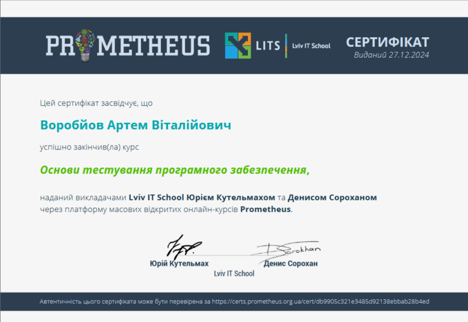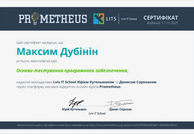 У підсумку проходження навчання, студентам Вдовиченко Н. В., Дубініну М. С. і Воробйову А. В. було видано сертифікати, що засвідчують успішне закінчення ними курсу «Основи тестування програмного забезпечення», наданого викладачами Lviv IT School (LITS) Юрієм Кутельмахом і Денисом Сороханом на засадах платформи масових відкритих онлайн-курсів Prometheus.