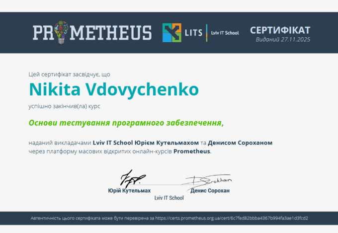 Здобувачі вищої освіти за освітньо-професійною програмою «Комп’ютерні системи та мережі» спеціальності «Комп’ютерна інженерія» Нікіта Вдовиченко, Максим Дубінін та Артем Воробйов отримали сертифікати про проходження навчального курсу «Основи тестування програмного забезпечення» на освітній платформі Prometheus.
