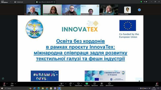 16 жовтня 2025 року як частина міжнародної ініціативи #ErasmusDays відбувся вебінар «Освіта без кордонів в рамках проєкту InnovaTex: міжнародна співпраця задля розвитку текстильної галузі та фешн індустрії». Захід організований українським координатором Еразмус+ проєкту InnovaTex – факультетом дизайну КНУТД за участі партнерів з ХНТУ: першого проректора Марії Артеменко, декана факультету інтегрованих технологій Марії Расторгуєвої та в.о. зав. відділом з навчально-наукової роботи і міжнародної діяльності Лариси Пономаренко.