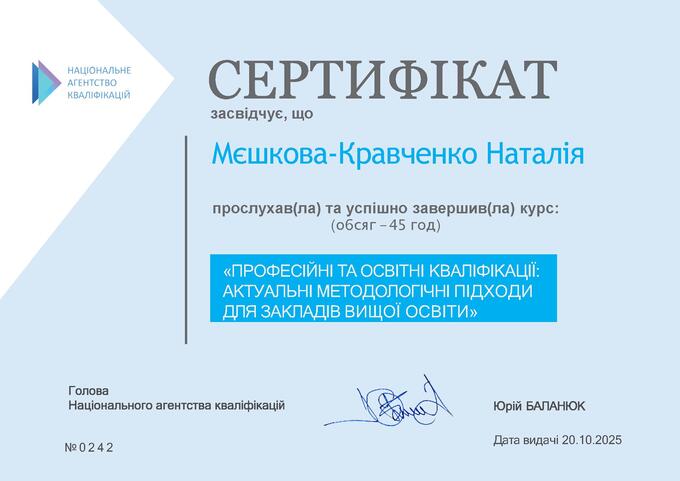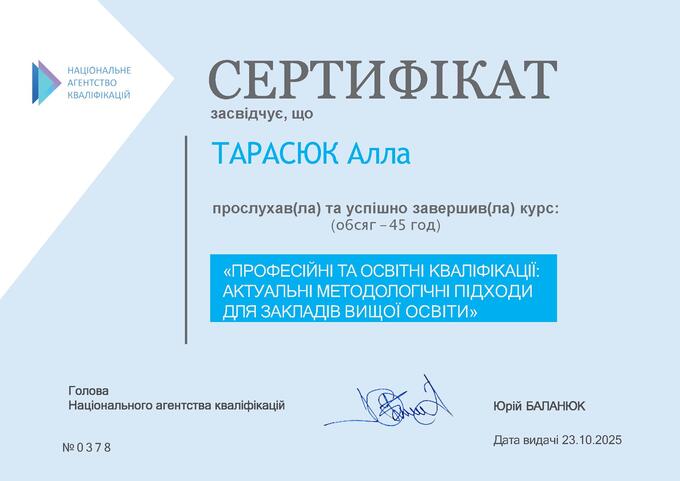 У контексті постійного оновлення підходів до підготовки фахівців завідувачка кафедри Економіки, підприємництва та економічної безпеки д.е.н., проф. Наталія Шандова та викладачі кафедри к.е.н., доц. Алла Тарасюк, к.т.н., доц. Наталія Олійник, ст. викладач Наталія Мєшкова-Кравченко долучилися до курсу підвищення кваліфікації «Професійні та освітні кваліфікації: актуальні методологічні підходи для закладів вищої освіти». Захід, організований Національним агентством кваліфікацій, став корисною платформою для обміну досвідом та впровадження сучасних освітніх практик.