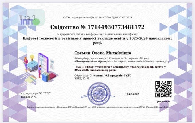 У вересні 2025 року Олена ЄРЕМЯН взяла участь у Всеукраїнській онлайн-конференції з підвищення кваліфікації «Цифрові технології в освітньому процесі закладів освіти». Конференцію, організовану ГО Інститутів післядипломної педагогічної освіти (ГО ІППО), було присвячено цифровим технологіям в освітньому процесі на 2025-2026 навчальний рік. Захід зосереджувався на використанні цифрових інструментів та платформ для покращення якості навчання і розширення можливостей для здобувачів освіти та викладачів, що є ключовим аспектом професійного розвитку педагогів.