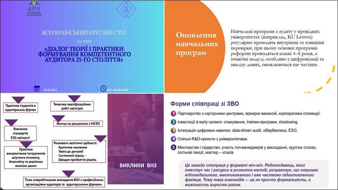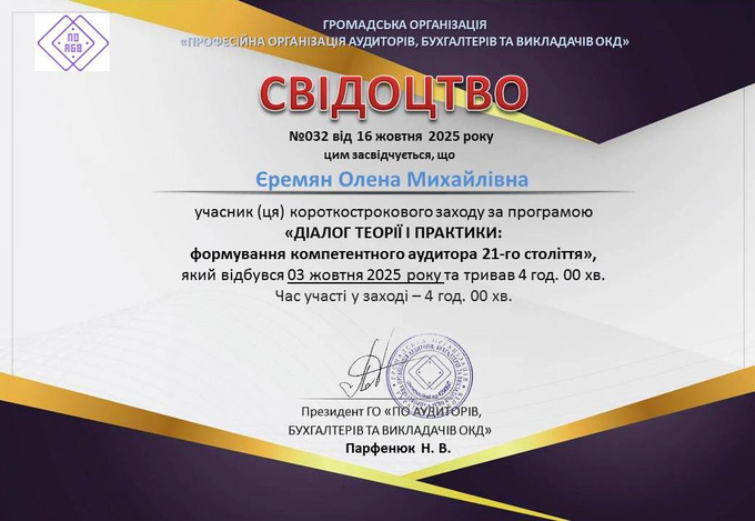 Наступним заходом підвищення кваліфікації стала участь Олени ЄРЕМЯН у Всеукраїнському круглому столі «Діалог теорії і практики: формування компетентного аудитора 21-го століття», організованому Аудиторською палатою України та ГО «Професійна організація аудиторів, бухгалтерів та викладачів обліково-контрольних дисциплін», членкинею якого вона є. Захід відбувся 03 жовтня 2025 року у м. Київ у подвійному (офлайн та онлайн) форматі та зібрав провідних представників академічної спільноти і практиків-аудиторів з усієї України. Метою круглого столу було обговорення шляхів ефективної інтеграції академічної освіти та практичної підготовки аудиторів відповідно до потреб ринку, сучасних викликів і міжнародних стандартів.