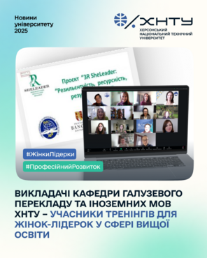 З 02 по 16 жовтня 2025 року завідувачка кафедри галузевого перекладу та іноземних мов Херсонського національного технічного університету Аеліта ЛЕБЕДЄВА та доцентка кафедри Кіра БАЙША брали участь у тренінгах у рамках міжнародного проєкту «3R SheLeader: Резильєнтність, Ресурсність, Результативність», що було реалізовано в партнерстві Хмельницького національного університету та Бангорського університету (Уельс) за підтримки British Council.