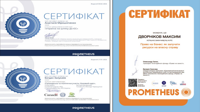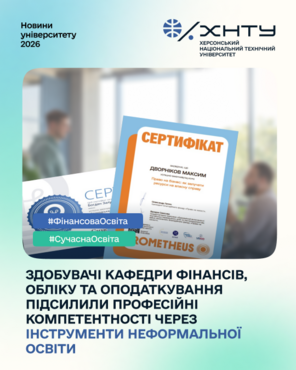 У межах практичної підготовки та виконання індивідуальних завдань здобувачі другого курсу спеціальностей 071 «Облік і оподаткування», 072 «Фінанси, банківська справа, страхування та фондовий ринок» та 292 «Міжнародні економічні відносини» успішно опанували комплекс із трьох профільних онлайн-курсів на платформі Prometheus: «Громадська та політична участь: базовий курс», «Україна на шляху до ЄС» та «Право на бізнес: як залучати ресурси на власну справу». Така освітня траєкторія спрямована на формування соціально відповідального фахівця, здатного ефективно працювати в умовах активної євроінтеграції України.