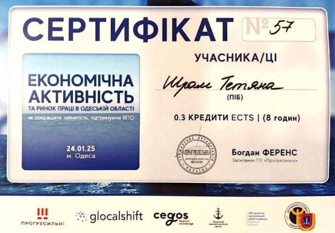 24 січня 2025 р. к.е.н., доцент, доцент кафедри фінансів, обліку та оподаткування Тетяна ШРАМ та бакалавр спеціальності 072 «Фінанси, банківська справа, страхування та фондовий ринок» Марина БЕРЕЗИНСЬКА відвідали публічний захід «Економічна активність та ринок праці в Одеській області. Як покращити зайнятість, підтримуючи ВПО?», організований ГО «Прогресильні».