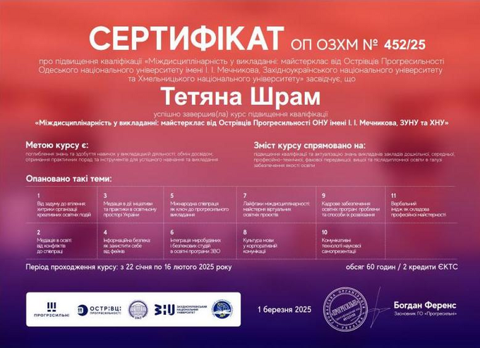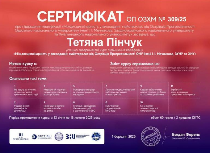 З 22 січня по 16 лютого 2025 рокудоценти кафедри фінансів, обліку та оподаткування Тетяна ПІНЧУК і Тетяна ШРАМ пройшли онлайн-курс підвищення кваліфікації «Міждисциплінарність у викладанні»від ГО «Прогресильні»