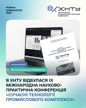 17-19 вересня 2025 року у Херсонському національному технічному університеті відбулася ІХ Міжнародна науково-практична конференція «Сучасні технології промислового комплексу». Захід зібрав понад 110 доповідей та об’єднав представників більш ніж 40 закладів вищої освіти та інших організацій України, а саме Вінницький національний медичний університет ім. М.І. Пирогова, Київський національний університет технологій та дизайну, Національний технічний університет України «КПІ імені Ігоря Сікорського», Дніпровський національний університет імені Олеся Гончара, Національний університет «Львівська політехніка», Херсонська державна морська академія, Херсонський національний технічний університет, Інститут проблем матеріалознавства ім. І.М. Францевича НАН України, Державне підприємство «Конструкторське бюро «Південне» ім. М.К. Янгеля», Інститут електрозварювання ім. Є.О. Патона НАН України, Інститут проблем міцності імені Г.С.Писаренка НАН України, Інститут транспортних систем і технологій НАН України та інші. Детальніше...