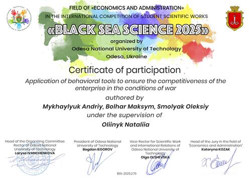 | Керівництво студентами і участь у першому етапі Міжнародного конкурсу наукових робіт здобувачів вищої освіти «Black Sea Science», 2025 |