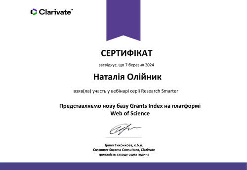 | Участь у вебінарі серії Research Smarter «Представляємо нову базу Grants Index на платформі Web of Science» на освітній платформі Clarivate. Сертифікат від 07.03.2024 р. |
