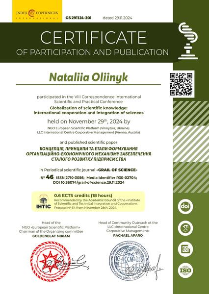 | Участь у ІІІ Міжнародній науково-практичній конференції «Фінансові інструменти сталого розвитку держави в умовах системної економічної трансформації», Сертифікат від 24.06.24 р. |