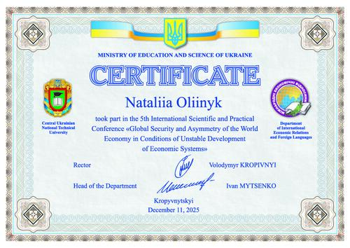 | Участь у роботі V Міжнародної науково-практичної конференції “Global Security and Asymmetry of the World Economics in the Conditions of Unstable Development of Economic Systems”, сертифікат від 11.12.26 р. |