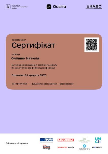 | Проходження навчального онлайн-курсу «Як захиститися від фейків і дезінформації» на платформі «Дія.Освіта». Сертифікат № С0085369137 від 20.06.25 р. |