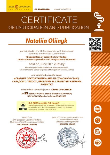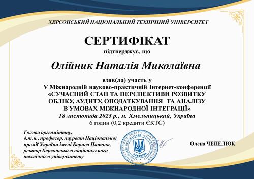 | Участь у V Міжнародній науково-практичній Інтернет-конференції «Сучасний стан та перспективи розвитку обліку, аудиту, оподаткування та аналізу в умовах міжнародної інтеграції», м. Хмельницький, Україна Сертифікат від 18 листопада 2025 р. |
