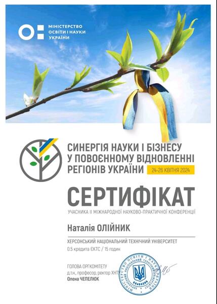 | Участь у ІІ Міжнародній науково-практичній конференції під егідою МОН «Синергія науки і бізнесу у повоєнному відновленні регіонів України» Сертифікат від26 квітня 2024 року |