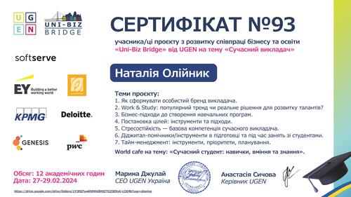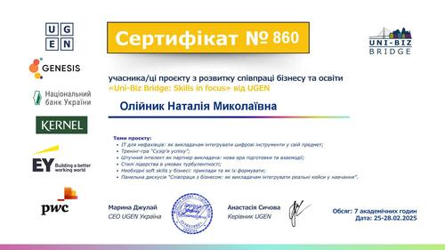 | Участь у проєкті з розвитку співпраці бізнесу та освіти «Uni-Biz Bridge: Skills in focus» від UGEN. Сертифікат № 860 від 25-28.02.2025 р |