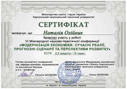 | Участь у VІ Міжнародній науково-практичній конференції “Модернізація економіки: сучасні реалії, прогнозні сценарії та перспективи розвитку". Сертифікат від 19.04.2024 р. |