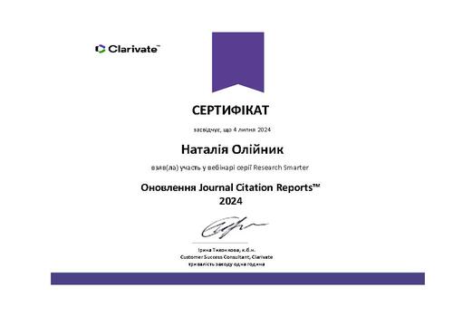 | Участь у вебінарі серії Research Smarter «Оновлення Journal Citation Reportstm 2024» на освітній платформі Clarivate. Сертифікат від 04.07.2024 р. |