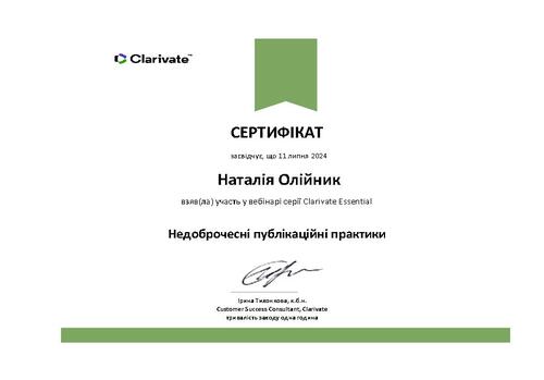 | Участь у вебінарі серії Clarivate Essential «Недоброчесні публікаційні практики» на освітній платформі Clarivate. Сертифікат від 11.07.2024 р. |