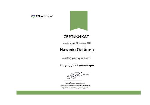 | Участь у вебінарі серії Research Smarter «Вступ до наукометрії» на освітній платформі Clarivate. Сертифікат від 21.03.2024 р. |