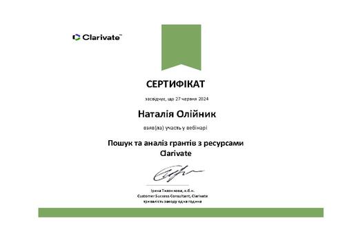 | Участь у вебінарі серії Research Smarter «Пошук та аналіз грантів з ресурсами Clarivate» на освітній платформі Clarivate. Сертифікат від 27.06.2024 р. |