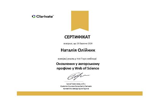 | Участь у вебінарі серії Research Smarter «Оновлення у авторському профілю у Web of Science» на освітній платформі Clarivate. Сертифікат від 28.03.2024 р. |