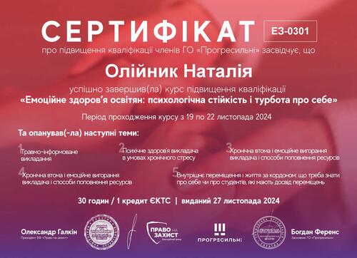| Навчання за курсом підвищення кваліфікації «Емоційне здоров'я освітян: психологічна стійкість і турбота про себе» – з 19.11.2024 р. по 22.11.2024 р. Сертифікат про підвищення кваліфікації № ЕЗ-0301 від ГО «Прогресильні», виданий 27.11.2024 р. |