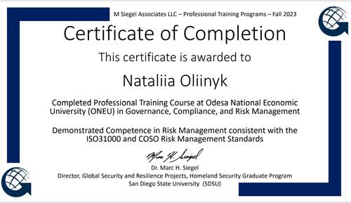 | Professional Training Programs. Certificate of Completion. Completed Professional Training Course at Odesa National Economic University (ONEU) in Governance, Compliance, and Risk Management. Fall 2023. Тривалість курсу: 6 тижнів |